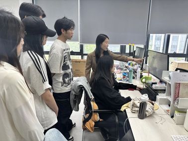 在公司运营主管与我校2025届优秀校友陈丽霞的共同引导下,在校学生先后深入直播间、内容剪辑工作室、数据分析中心等核心业务区域。陈丽霞校友也结合自身从实习生成长为部门骨干的经历,向同学们系统介绍了公司服务快消品牌的全流程:从品牌需求分析、内容创意策划,到直播脚本撰写、流量运营策略及用户数据分析。她强调:“新媒体行业的核心竞争力在于‘快速响应与精准创新’,同学们在校期间不仅要夯实营销理论基础,更要主动参与实践项目,培养数据敏感度与创意落地能力。”
